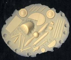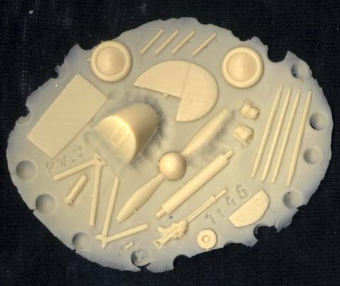 The remianing parts are on a wafer and consist of: fin/rudder, wheels, propellor/spinner, struts, Lewis gun, cotrol panel, two engine cylinders, seat and floor. Of the entire kit the only pitting is on the drum for the Lewis gun.