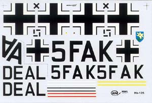 Decals are provided for two machines, one based in Finland and one in North Africa. The Finland bird wears RLM 70/71 splinter cammo over RLM 65; the North African, RLM 79/80 over 78. Decals are sharp and perfectly registered, and appear quite opaque. Not having used MPM decals before, I don't know how they'll perform, however.