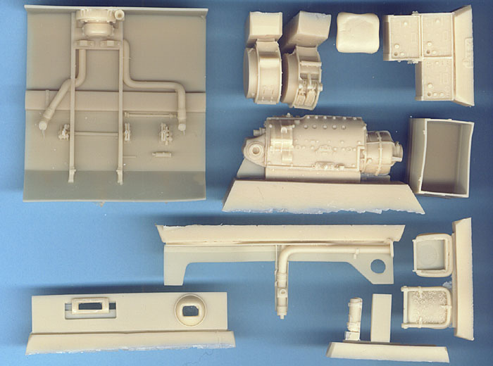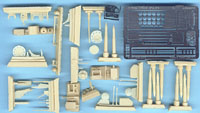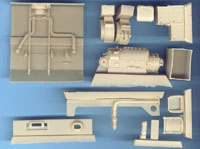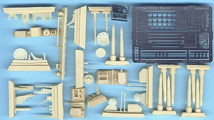 CMK's 1/35 Pz.Kpfw IV Driver's Compartment Set CMK3012 For the Tamiya Kit Photoetch and Resin Parts Tamiya's armor kits are very nice kits, but they can't touch the quality of cast resin for detail parts. This set fills up the driver's compartment very nicely. There are three bags of resin parts and one fret of photoetch. The compartment starts out with a one-piece floor that is designed to fit perfectly into the Tamiya kit. A transmission housing fits onto this and is completed with drive axles and instruments. Steering clutches are also present and are very well cast. The control pedals are separate and are mounted onto a separate forward bulkhead. The driver's seat is very nicely molded and is made up of four pieces. The radio operator/gunner's seat is a bit simpler in construction but still very well detailed. Behind the driver's seat is an ammunition storage box, complete with many shells. Other details in this set include radios, fire extinguishers, and a very nicely done and complicated MG 34 machine gun in a ball mount. No barrel is provided, so you'll want to save that from the kit parts. ...............  In looking at the boxtop photos this set will really look awesome when finished. How much of it will actually be visible once the top hull is in place probably isn't going to be much, but if you open up all the hatches you should be able to see quite a bit and besides, you will know it's all there, right? If you're wanting to go that extra step on your next Panzer IV, definitely check this set out. |         |