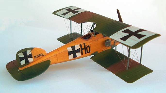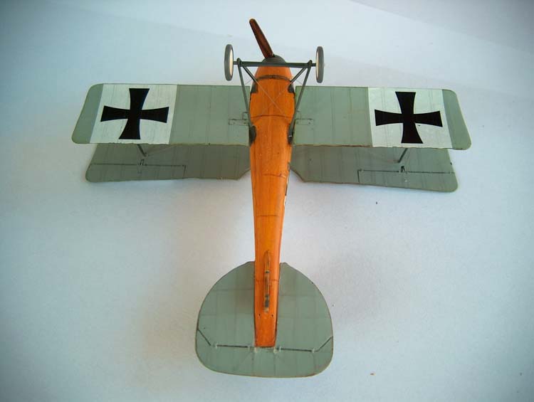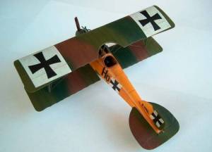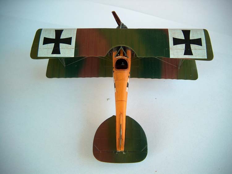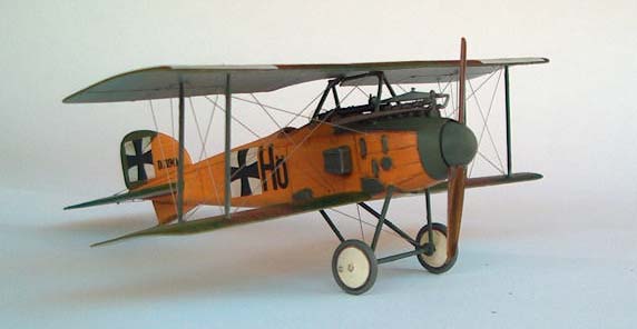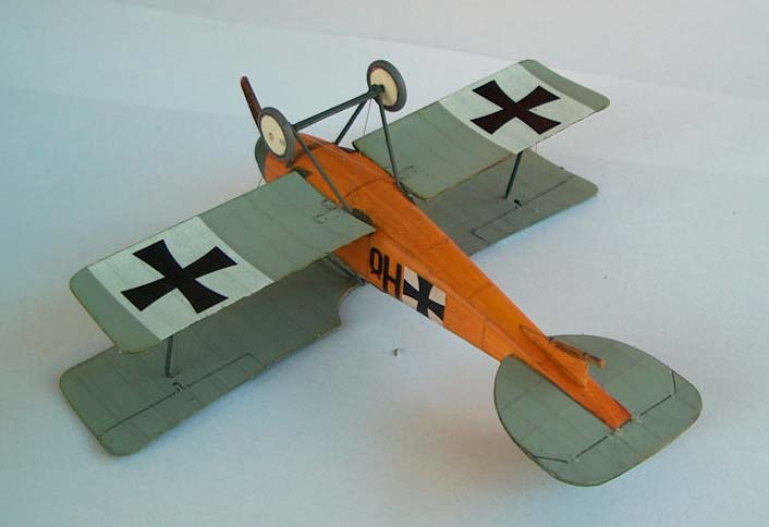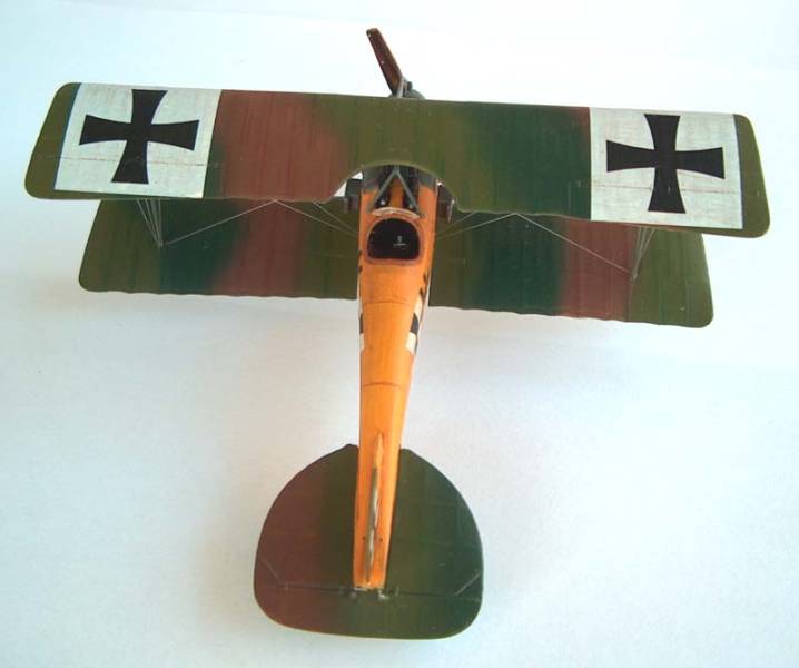 Roden 1/72nd Albatros D.I |  | History The Albatros D.I was the answer Germany came up with in late 1916 to try to regain the air superiority it had enjoyed before the arrival on the fighting skies of the sleek Nieuport scouts and the DH2 that, in their turn, managed to temporarily subdue the devastating effects of the infamous Fokker Eindecker. The nicely streamlined aircraft would over the years evolve from the slab sided D.I to the gracious fishlike D.V in what was to become one of the most produced aircraft series of the whole war. The Kit As a quick check of Roden's catalogue proves, it has been the policy of the company to extract as many versions as possible from one basic set of tooling for any given aircraft kit they set their engineering minds on. I for one am quite happy with this as even though some compromises have to be made to allow for the easy "transfiguration" of a basic part into its various variants, that sometimes translate into a bit more of work during assembly, I think that just to be able to have at one's disposal 10 different members of the Albatros fighter family more than compensates for this. Several reviews of Roden Albatros D. fighters have appeared lately over the Internet, and our beloved IM is, of course, no exception and a very beautiful Oeffag D.II made by regular contributor Michael Kendix can be found in the September 2002 edition. Having already bagged a couple of Oeffag D.IIIs (pictures of one at the World War I Modeling Page) I decided to try my hand at where it all began and grabbed Roden box ref.001 from my stash of unbuilt kits. Construction First thing I did was to assemble the multi-part wing (remember what I said about getting the most of one basic set of moulds?....). Now this is not particularly difficult and I used my usual picking on other people's brains technique (in this case modeller and friend Shane Weier whose gorgeous work can also be visited at the World War I Modeling Page): bring the 3 parts together and push the leading edge against some sort of rigid stopping surface, be careful to lift the trailing edge of the centre section with a bit of card underneath it, since that way it'll be sure to follow the curvature of the other adjoining sections. Carefully run liquid glue over the joints and capillarity will do the rest for you. A touch with your favourite brand of filler on the joints when dry will even it all out. I then turned my attention to the fuselage and after scraping away some of the beautifully moulded inspection "lids" as per instructions I painted the inside of the parts Humbrol 63 in preparation for my usual "woodworking". This is accomplished by "colouring" the base coat with several shades of brown water-colour pencils, the water-colour being then buffed to blend it with a dry Q-tip. The moulded in structure was also painted in a darker shade of brown and some scratchbuilt side instrument/switch panels were installed in place following a picture of an Albatros cockpit. Since on the real thing there was a fabric panel to the rear of the seat to "close" the cockpit, I replicated this with a piece of masking tape (and I didn't have to paint it since the tape is quite CDLish looking ;-). Seatbelts made of lead foil were also installed, the control column was slightly modified through the addition of a cross-member at the base that also acted as a great seam hiding device (thanks again Shane). Time to deal with the engine, and this beautiful piece of moulding is easily assembled as per instructions and painted in several shades of metallic grey. The instructions tell us that the engine should be now inserted in place in one of the fuselage halves, but for it to fit I had to shave a bit on each side of the sump. This might not be the best solution since the front end of the fuselage is really the most troublesome area of the kit and pushing the engine in also pushes the fuselage sides a bit outward modifying its curvature. I've heard from others that it is best to close the fuselage first and then insert the engine (of course this means removing part of the side fuselage bearers) but I've yet to try it. With the fuselages halves closed I installed the front cockpit/top cowling part (23D) and this was not a perfect fit due to the aforementioned modification of the curvature that pushing the engine in imparted to the fuselage. I would also have the same problem with part 3A which is a conical ring that should fit perfectly into the front end of the fuselage but again the fit was far from perfect . Well, never one to give up easily, I faired it all in with milliput and restored the panel detail scribing with the tip of a straight pin. The ventral seam of the fuselage also needs some filling attention since probably due to some moulding flaw you end up getting a concave seam that has to be brought to shape with the filler of your choice. The elevator/stabilisers also benefit from gluing to each of their roots a piece of .005 card (did I say I used quite a few of Shane's ideas on this one?). If you don't do that there will be a nasty gap between the fuselage and the tailplane that will need filling. Time to glue the lower wings on and this is another area that does require some extra care: the actual contact area between the wing and the fuselage is very small and you should do better than me and reinforce the joint by inserting pins into the wing root and drill matching holes on the fuselage sides. I didn't and have regret it ever since because while rigging the kit both wings came off.... luckily the rigging and the interplane struts held everything together and I was able to glue them on again, but I was left with a bit of anhedral on the lower wing that is not correct and wasn't there in the first place. With the lower wing on construction is now really straightforward, even the operation of laying on the top wing is easily achieved if you first glue it on by the cabanes only leaving it to dry with some sort of jig hold
