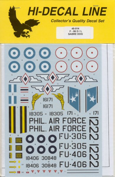 | Hi-Decal 1/48 Decals |   | The folks at Hi-Decal have released two new sets in their growing line of 1/48 markings. Let's take a look:    48-014 F-86D/L Sabre Dog Recommended Kit: Revell/Monogram or Revell/Germany 1/48 F-86D This set provides a refreshing variety of subjects for the outstanding Revell 1/48 F-86D Sabre Dog. Markings for four aircraft are provided along with maintenance stenciling for three aircraft. These include: -
