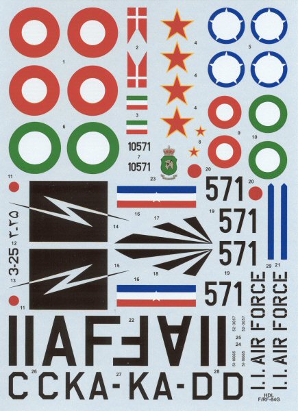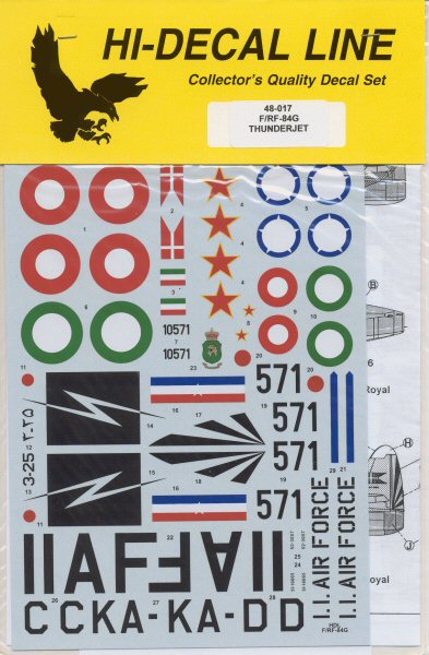 F-84G, Imperial Iranian AF, Mehrabad AFB, 1960 (bare metal) These sets provide some unique color schemes and subjects that are largely ignored by other aftermarket decal manufacturers. Kudos to Hi-Decal for filling in these gaps! Hi-Decals are availabe from Squadron and from Hannants. My sincere thanks to Hi-Decal for these review samples! |           |