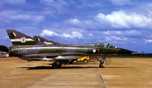 And here we go a wee bit around the corner to Australia for a Mirage III. It has been confirmed that it is from No. 77 Squadron. The tail flash is commonly called the "Grumpy Monkey." It appears to be at RAAF Base Williamtown in New South Wales. | ![]() |