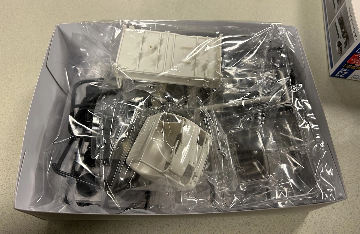 I was more excited than usual to attend IPMS/Seattle’s February meeting when it was announced that Aoshima was donating some of their snap-together kits to the club. In return for the free kits the club members would commit to either finish the kits during the meeting or have them built by next month’s meeting. I chose the 1/32nd scale Hino Dutro 2 ton light flatbed truck. It’s a straightforward and simple yet highly detailed kit, consisting of 35 parts molded in cream, silver, black and clear plastic.