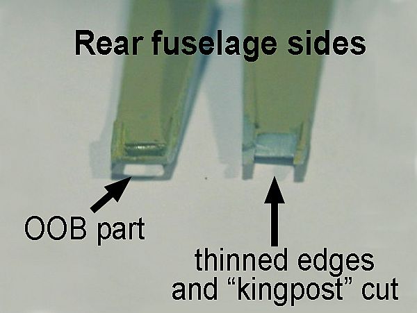 Both fuselage sides (Parts 10 and 11) have the correct cutout by the tail, but note that each one has a tail kingpost molded in it. You should cut off one of them, or else you'll get two parallel kingposts in the tail, which is one too much. Don't forget to sand a little along the upper edges of these parts, as they have a near invisible molding line that may interfere later with the proper fit of the separate turtledeck (part 23).