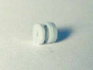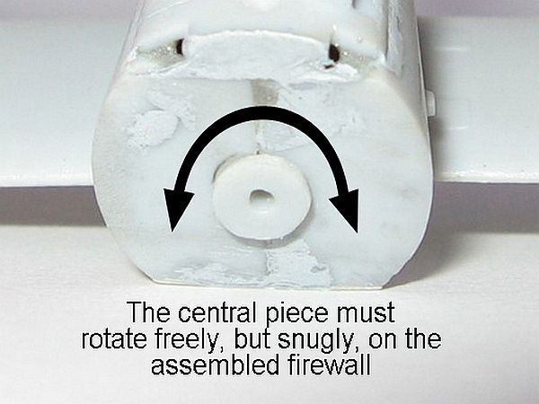 The infamous Part 42 (drawn on the instruction sheet as a shallow cylindrical piece with a flange) should fit inside a central aperture in the firewall. In fact, part 42 doesn't look much like the drawing, being a thick little disc with a hole in the middle. At a later stage, this hole should fit tightly around the engine rear "axle" (part 34), as both these pieces form a sort of sheave, that inserted on the firewall allows the scale rotary engine to spin along with the propeller. I