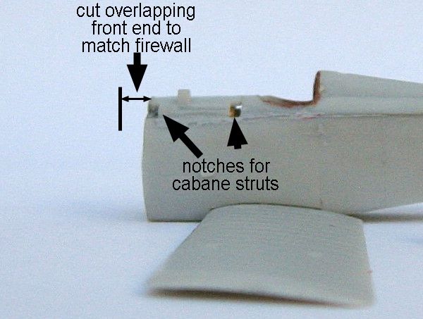 Don't despair yet! The solution is simple, but requires a bit of surgery: cut that pesky surplus length off the front of this piece. Then carefully notch each front corner with a sharp blade, where the front cabane strut roots will sit later. Remember: the struts sit directly over the firewall, so there's not difficult to place the notches correctly.