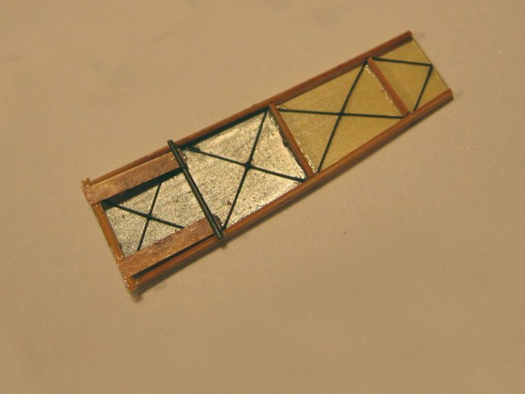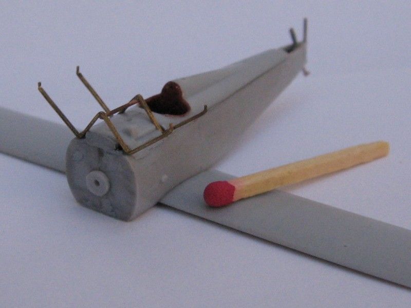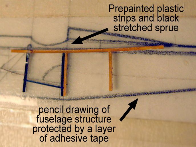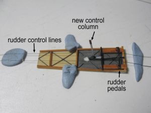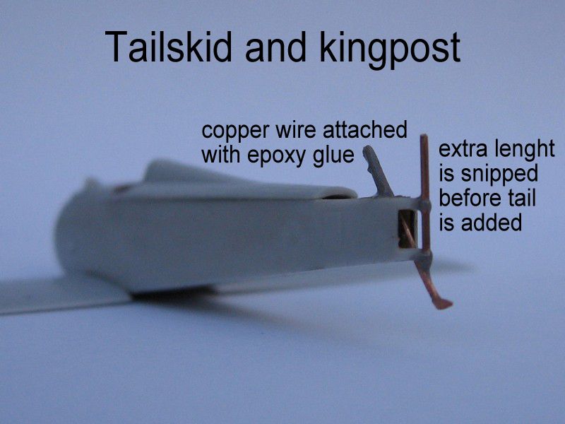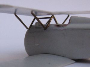 I also replaced thefuselage kingpost with a short, straight length of copper wire, which made the rear of the assembly sturdier. Diagonal lengths of black sprue were the final touches for the tail area structure.