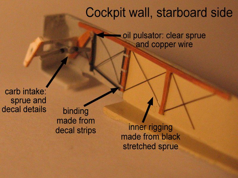 It was time to paint the interior surfaces: aluminium grey for the side panels and clear doped linen for the aft fuselage, as you can see a good deal on inner surface on the assembled model by perusing inside by the cockpit hole. You don't want to see a bare plastic spot once you can't reach it!