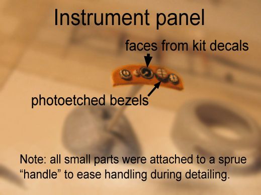 Using the decals from the kit, I replaced the instrument panel original part (that doesn't fit anymore, once the fuselage was thinned) by a better shaped styrene replacement. I painted the panel as "wood" and then put each face separately, as the real thing had some instrument cases screwed on to the panel, and some installed behind it. This is impossible to make with just a decal slapped on a flat surface! I framed each instrument face with a photoetched bezel, fixed simply with a droplet of Future floor polish. Once dry, Future shrinks and keeps the bezel in place without any glue spooges showing up. For some instruments, I added more droplets of Future to get a domed glass effect. Behind the panel I added a squarish piece of styrene, representing the ammo box installed there and that was visible on the reference cockpit pictures.