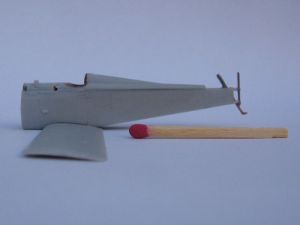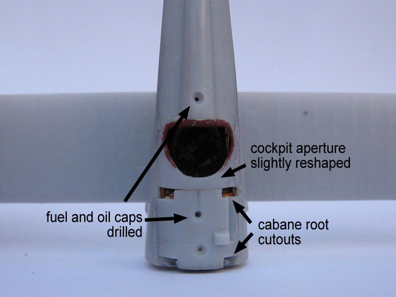 The fuselage sides have two small pips that represent the intake pipes for the engine carburettor (these are not exhaust pipes!!!). As they were molded solid, I erased them and replaced by slices of aluminium tube, slightly crimped to have a teardrop shape. I fixed them to the sides with a drop of matt varnish.
