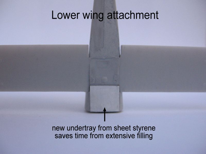 The lower wings (part 3) include the lower centre section of the fuselage, and it should fit a slot below it. On my model, fitting it took a while, as the wing slot on the fuselage was too narrow for the centre of the lower wings. Careful sanding of the fuselage slot edges, centre section of the wings and adjustment of the curved edges where the wings should meet the fuselage sides, eventually made all the parts click together. I thinned a bit the centre of the wings to make room for the new styrene floor of the cockpit. Finally, I deepened the strut location holes, and made new, shallow ones where the rigging was to be anchored later. Note that the aileron control line exits on the upper surfaceon the lower wing were absent on the kit, so it's easier to locate this and drill them when the model upper wing is still off.