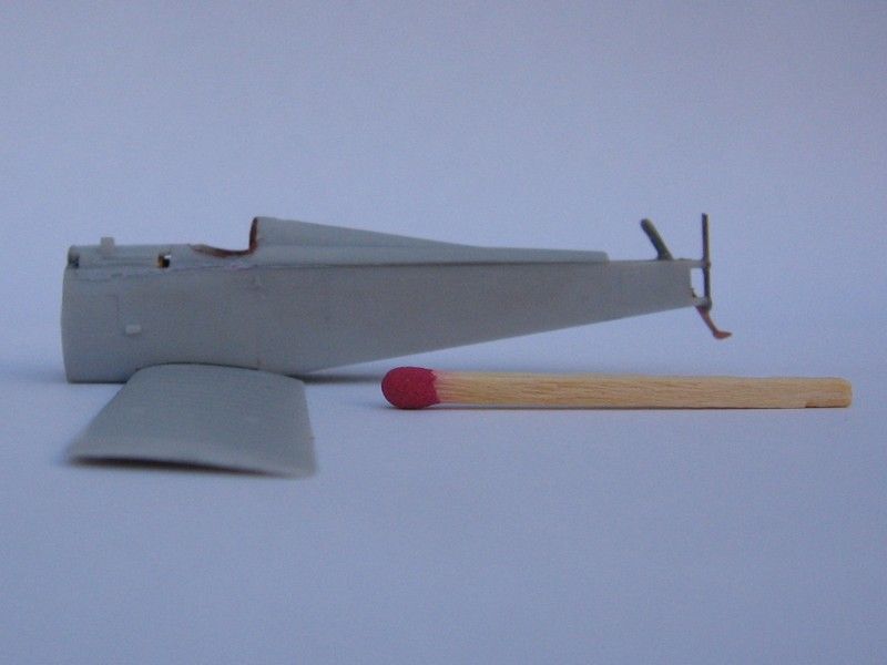 By this time you should be fully aware of how obsessive I am about the fuselage interior. So, to make the picture complete, I thinned a bit the exposed tail structural longerons and "fabric" edges, and discarded the flimsy plastic tailskid part for a sturdier one made from copper wire, filed to shape. This is important: the model will rest on this small point at the rear, and it's better to make sure that the tailskid (and undercarriage) are as strong as possible.