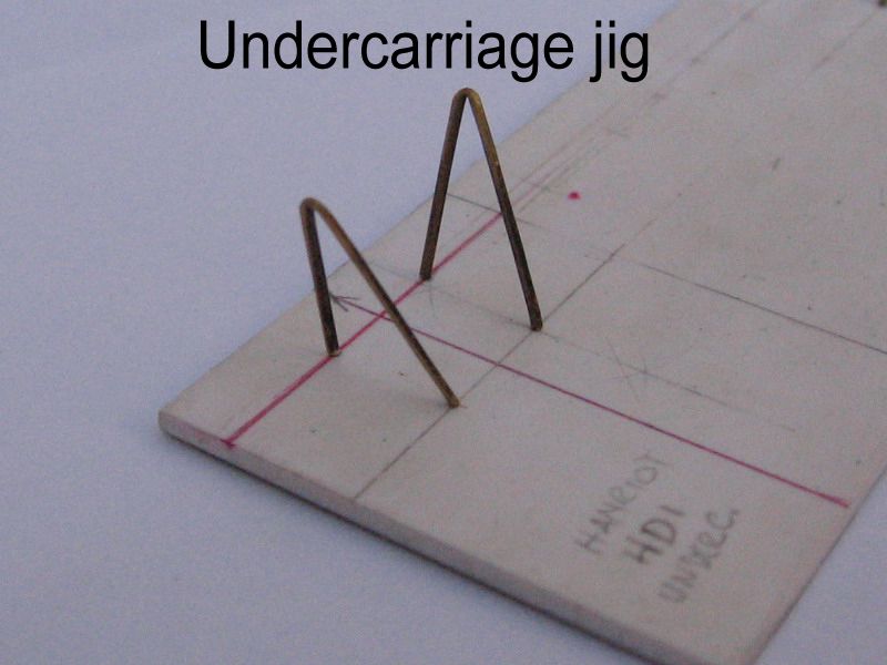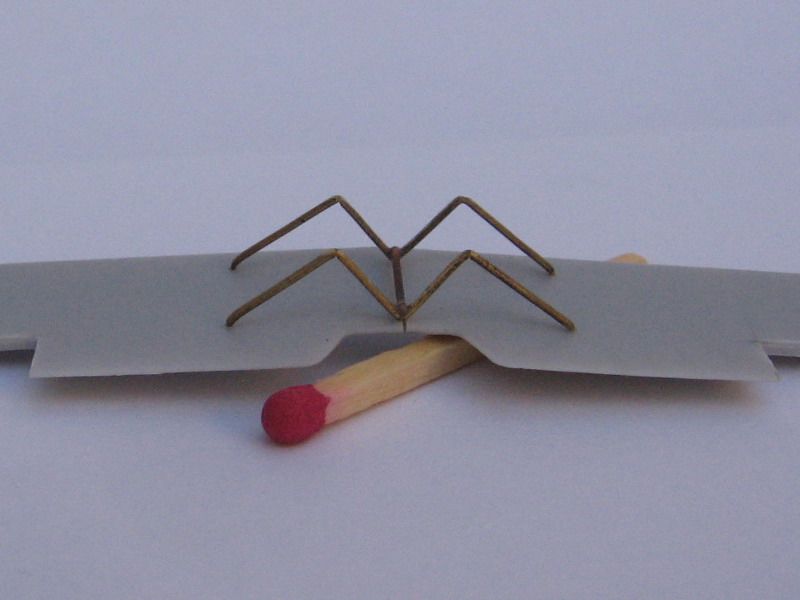I made a jig to put the fragile undercarriage structure together without handling the rest of the model. I glued the strut pins in them with white glue, but used epoxy glue to fix the axle to the vee apex, always checking for the correct placement along each guide line marked on the base sheet. The result is having the undercarriage (less wheels) assembled upside down on the base. Once all joints were dry, the assembly was freed from the styrene base. Then, it's just a matter of gluing it again to the model fuselage, and touching up the leg roots with a dab of paint to hide the joint. Careful, as this structure is weak until you add rigging to it, since this makes it stronger as it was in the real thing.