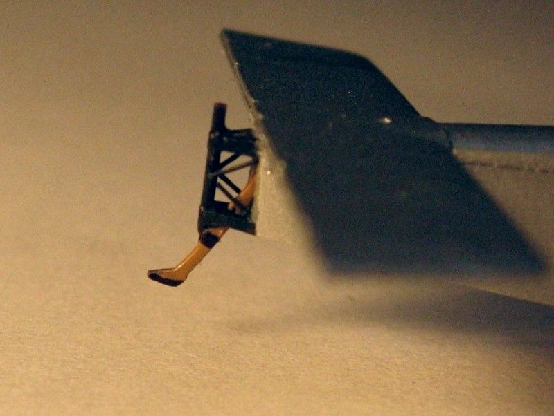 I attempted to refine it by sanding and scraping with a hobby knife, but ended up breaking it. I put too much strains on parts that were small and delicate from the start. Gluing again the broken leg won't do, so I made a new pair of vees from extruded brass lengths. That gave me a sturdier undercarriage unit and taught me a lesson when not to mess with soft plastic for small, thin features that also serve a structural purpose.