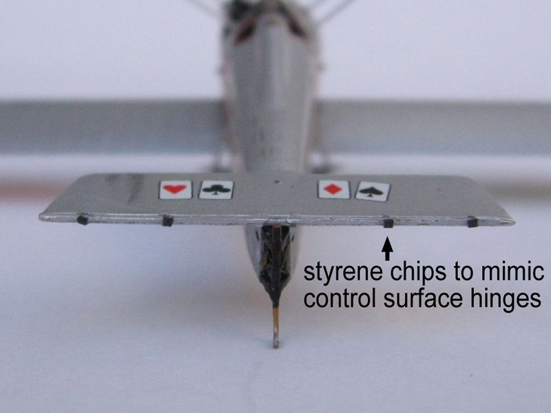 On early aircraft, ailerons, elevators and rudders were hinged to other fixed surfaces leaving a slight gap, a sort of see-through effect absent in more aerodynamically advanced aircraft. To achieve this, I glued the control surfaces to the wings and tail using small chips of black, thin styrene sheet between the pieces.
