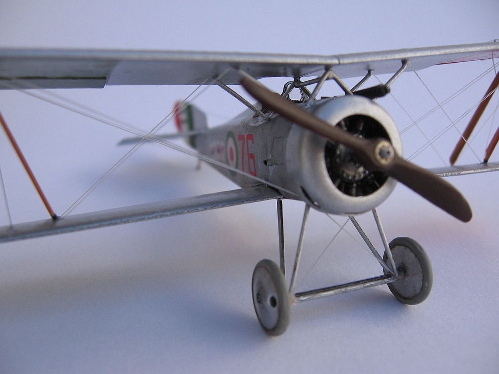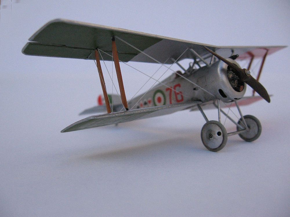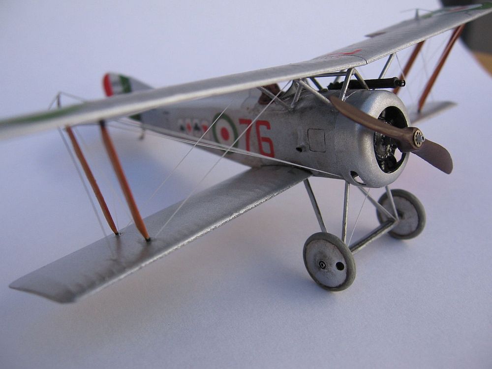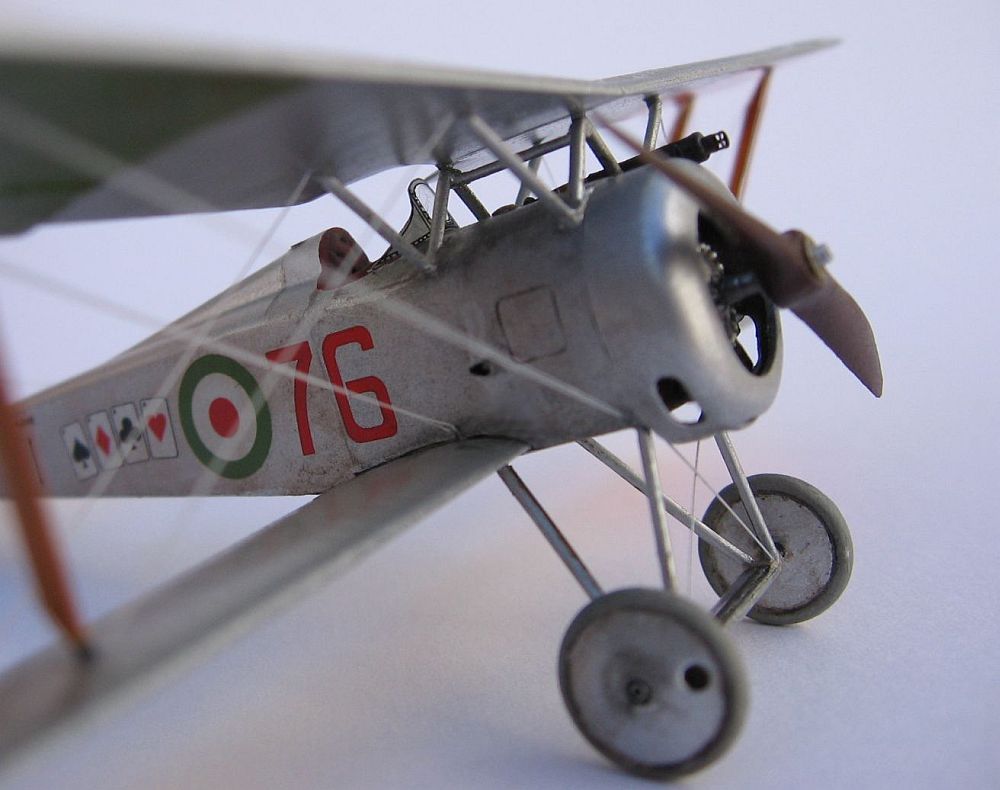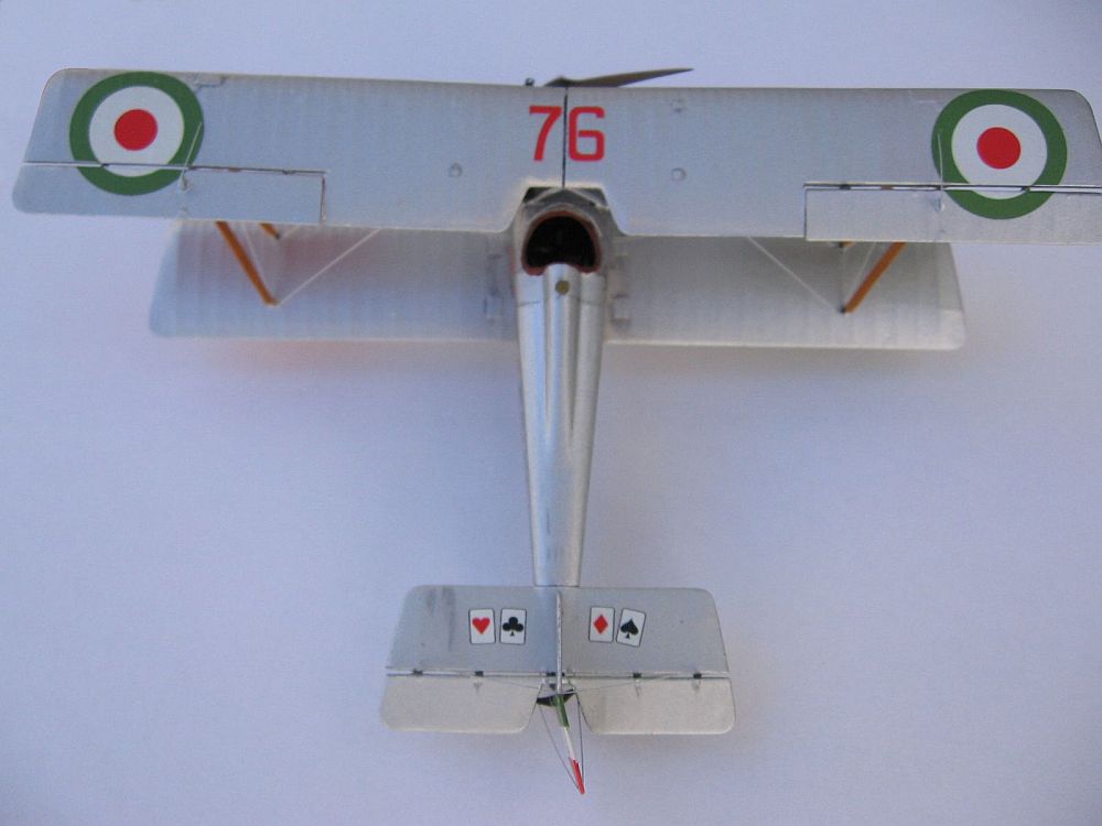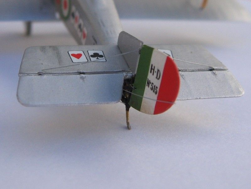 I chose for my model the paint scheme of Tenente Flavio T. Baracchini, (No.515), decorated with a poker of aces at each side of the fuselage and over the tail, one of the various decal options offered with the kit, and the subject of the box art painting. Instructions state a clear doped linen colour overall, however, this photo shows the surface shine of a brightly aluminium painted machine, which was typical of French imported machines. Thus I painted the model entirely with Humbrol 11 enamel. Since the front fuselage panels and cowl were just bare aluminium sheet on the real airplanes, I used a thinned mix of water and "Boltgun Metal" Citadel acrylic over these panels, that gave a slightly darker hue to the front of the bus. According to marking practices of the time, all wing undersides were painted with areas of "Flag Red" (port) and "Flag Green" (starboard). The underside of the wings had a small "return" of the silver colour of the upper surfaces, and doing this neatly had me scratching my head for a good while. I have a silver Sharpie marker, which matched the Humbrol 11 paint spot on. I ran the side of the tip around the edges of each wing and voilá: silver edges! I left it to dry a few days and sealed the colours with Future, which gave an uniform sheen to the surface.