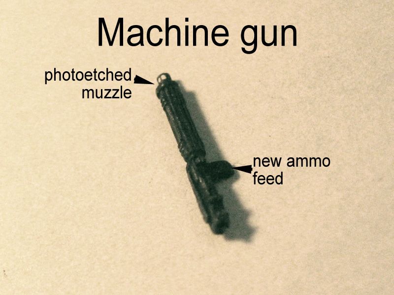 To replace it, I cut a small slice of sprue and glued it to the machine gun (part 22, gentlemen, and it comes twice on the tree). The gun itself is surprisingly coarse, given the high quality and subtleness of the rest of the kit. But once cleaned up, painted and accented with a rub of a graphite pencil lead, it's a decent representation. I only added a photoetched muzzle to it, as to improve the only area where it can be seen clearly on the assembled model.