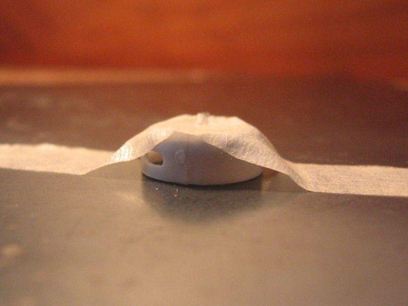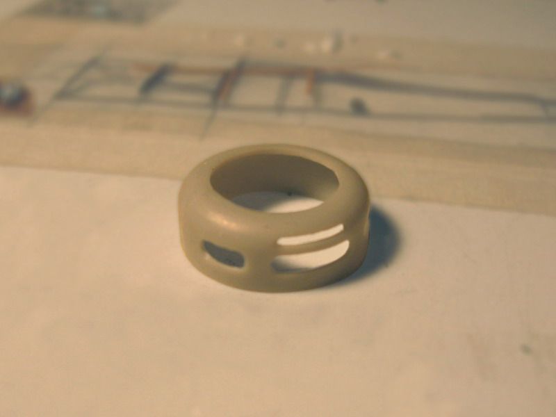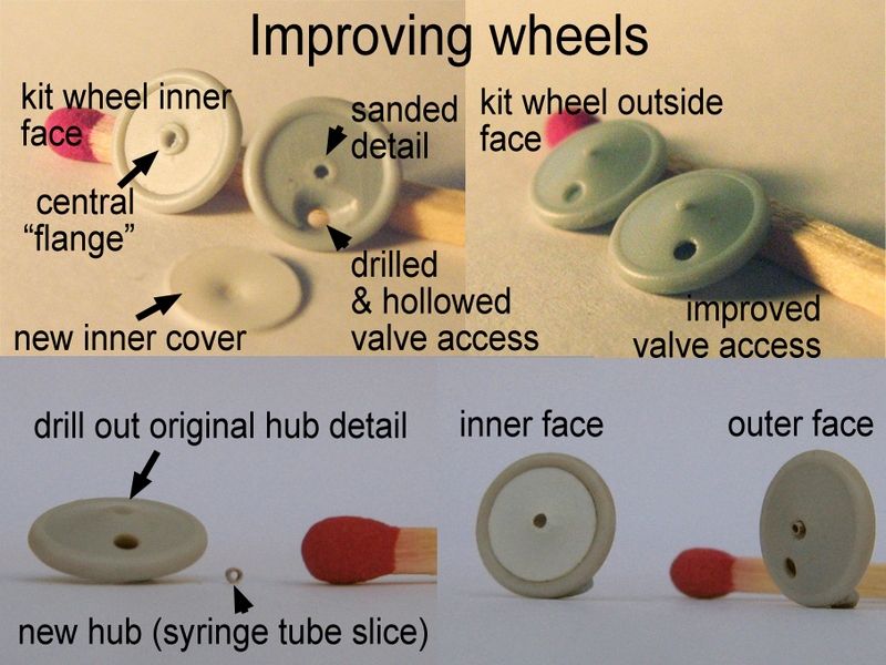 I also spiffed up the wheels, that were molded with a small pimple for the axle end and dished canvas covers over the outside face (the covers were used to keep the spokes free from dirt or mud besides being a simple streamlining device). The hole for the pneumatic valve is just a shallow depressed circle. The inner face of the wheel was a flat surface with a round "flange" instead of the prototypical shallow cone.