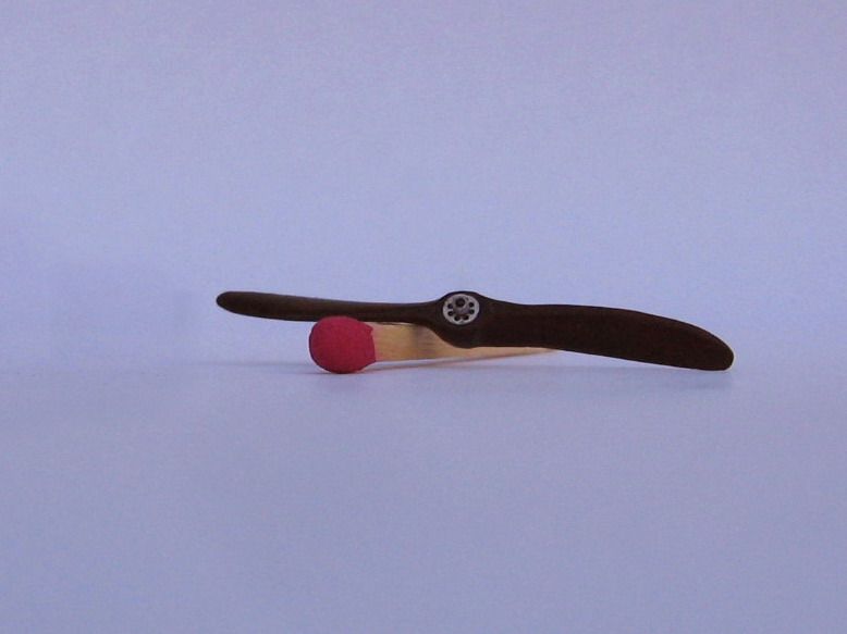 I smeared some putty around the hub sides, and when dry, I sanded and filed this to give the centre of the propeller a sharper and more cylindrical shape. Besides, I scraped and sanded the propeller tips and trailing edges to razor sharpness. The hub plate was accidentally damaged while doing this –glad I'm not a surgeon!- so the front and rear surfaces were sanded flat and a replacement photoetched plate was fixed to the mahogany painted prop body. I also added a back plate from a circle of styrene painted silver, since this feature was relatively easy to spot if the model is seen from the sides. Over the hub plate, I added a tiny segment of plastic tube, representing the hollow end of the engine axle, a common feature of the Hanriots. Styles of hub plates and retaining bolts can vary, so it's always useful to check with pictures of the real thing when available.