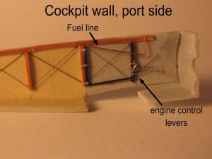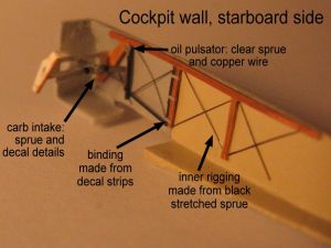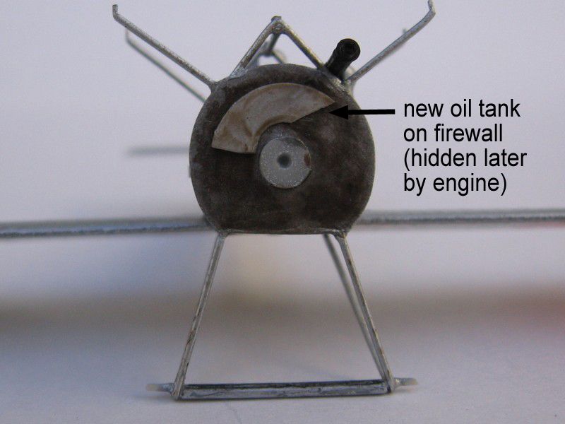 Once assembled, the firewall lacks the typical exhaust channel (an angled surface behind and below the engine) found on most rotary-powered airplanes. Checking my references indicated that only some Hanriots had them, and thus I chose not to add it to the model.