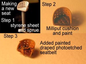 I shaved off the central flange and gouged the inner face behind the cover valve hole getting near-scale edges for it. A new inner cover surface from 0.05" styrene was cut and dished –slightly!- by pressing a drill bit butt on the centre, over a magazine (don't do this on your valuable reference material as this leaves dimples on it! Don't ask me how I know). Paint the interior of the inner wheel cover matt light grey, then glue it to the outer section of the wheels. I also drilled the centre of the outer wheel cover, and added a small section of bright syringe tube as the axle end. Without them, the wheels still resembled a small plastic nipple! The final step is to glue the pre-painted wheels to each axle end, and bind a few turns of sewing thread with white glue to represent the bungee cords.