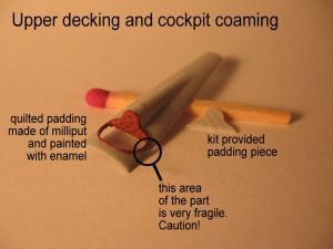 The front decking (one of three options in the kit), is a curved affair which includes a number a details –and most importantly the attachment points of the cabane struts-. Its rear edge should meet the front of the cockpit coaming and aft turtledeck. Unfortunately the front decking is molded more than 1mm too long! This throws off the geometry of the cabane struts (thus, the stagger of the wings), where the machine gun is attached and the placement of the cockpit along the fuselage length.