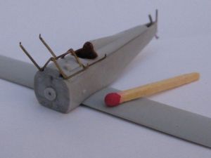 The wheel axle is molded straight and along with two spreader bars around it. In the real airplane, however, the axle was "split" on a central flexing point. After the sobering experience of the legs, I used the axle straight from the box, as it had the correct width and was strong enough to endure frequent fiddling during the assembly process.