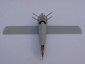 It was easy, and to make sure I had them bent equally and accurately, I made a jig placing holes on a scrap of thick styrene sheet in the same spacing as the roots on the fuselage coaming, and the ends under the upper wings. The two Ws were joined with a cross piece along the central edge and epoxy glued to the fuselage, using the upper wings (part 12) as a help to place the struts correctly.