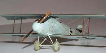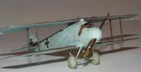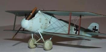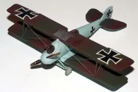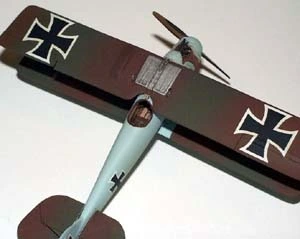 There were at least two basic schemes for Roland D.IIs. One is an overall green and red/brown camouflage scheme with blue/grey undersurfaces while the other is an overall blue/grey fuselage and undersurfaces, with the green and red/brown camouflage on the upper part of the flying surfaces only. It was the later scheme I chose. I really think the camouflage with the overall blue/grey is very striking. I used Polly Scale Panzer Red/Brown for the red/brown, French Fokker Dark Green for the green, and German RLM64 Lt. Blue for the blue/grey. Decals are all from the kit. I then applied of coat of oil over everything. Rigging is .005" stainless steel "surgical" wire.