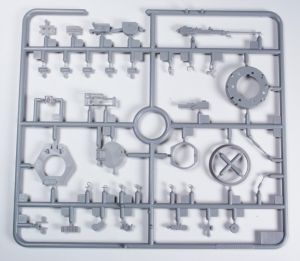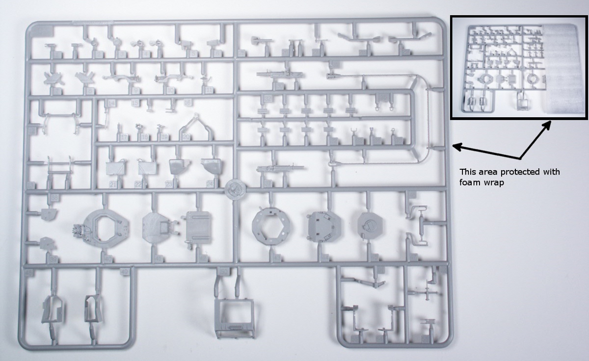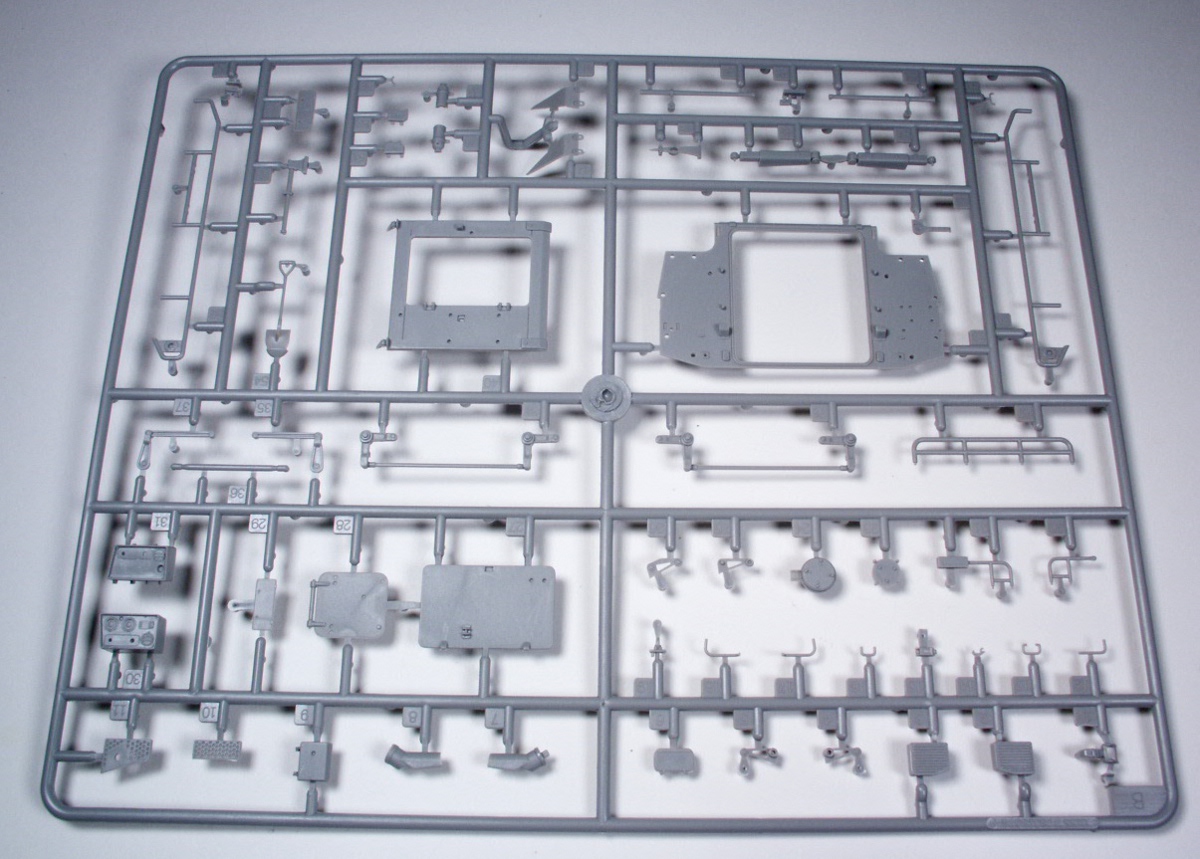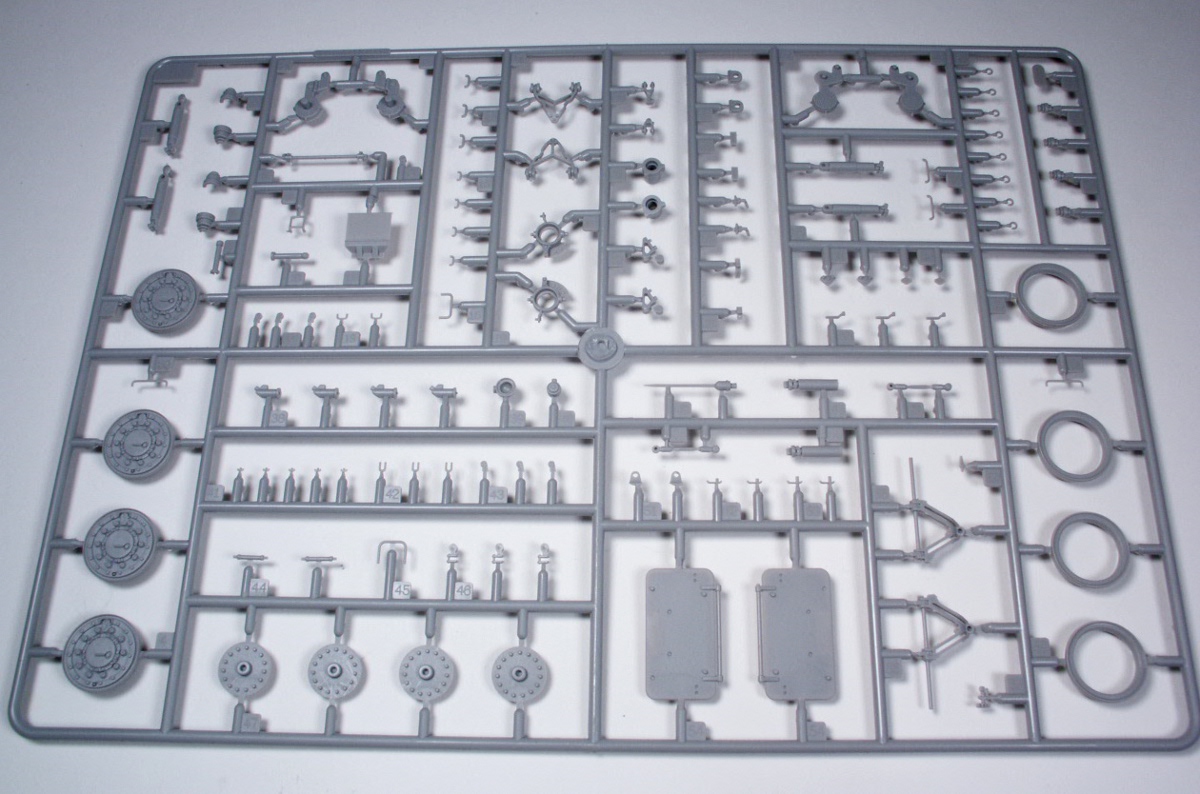 The sprues are completely free of flash, and mold halve alignment is excellent on all parts and as such, the mold half seam lines are very fine through out. Surface detail is well defined. Sprue attachment points do seem a bit oversized on some of the smaller parts however.