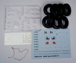 Five gray plastic sprues, one clear parts sprue, upper and lower hull halves, one fret of photoetch with 9 pieces, an extensive decal sheet, a length of fine chain, and finally 8 rubber tires. The instruction book is Trumpeter’s standard bifold, visual diagram format, with a full page sprue diagram inside the front cover. There is also a full color, 2-sided paint and markings guide in the kit which shows the basic paint scheme and on the flip side, shows a multitude of markings options available on the decal sheet.