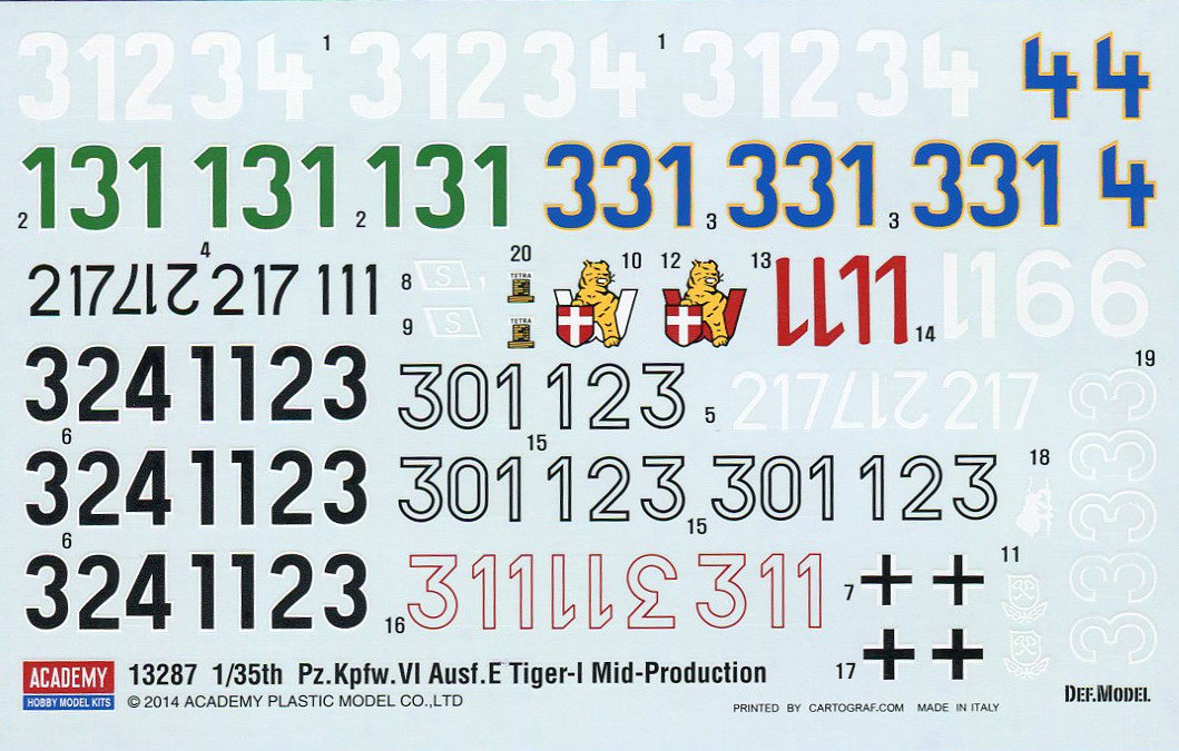 The decal sheet is small, crisply printed, legible and in-register. It includes markings for 11 Tigers: