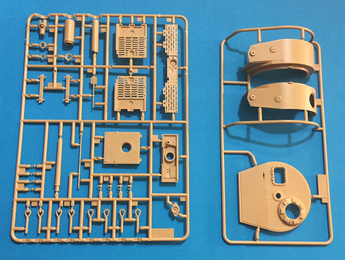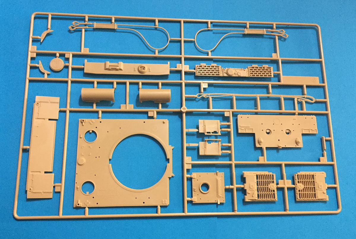 The hull upper structure is nicely detailed. The rear upper hull is very well rendered and in conjunction with the PE ventilation screens, it looks very accurate. Virtually every item attached to the upper hull superstructure, including the towing cables, is an individual item to be attached, one by one. I associate molded-on "detail bits" with smaller scale armor and I think this is a positive development. The turret is well molded and it includes spare track links and stowage bins.
