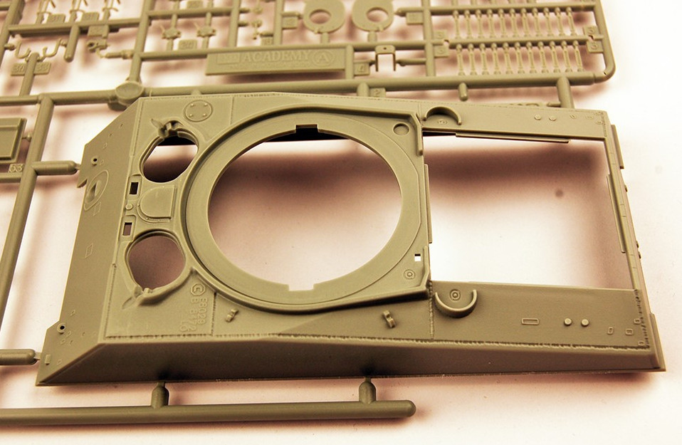 The turret comes with alternative parts for the commander's hatch, either an earlier split hatch, or the later all-round vision block single hatch. Foundry casting numbers for the turret hatch parts are hit and miss, mostly miss. The split hatch parts have casting numbers, as does the main gun shield. However, there are none on the main turret shell, nor the shell ejection port. The 75mm main gun is a two-part affair, with a separate "tip", which will cause fit issues. I can't believe Academy doesn't have the ability to mold this as one piece? Either way, they chose not to. The turret shell is in two pieces, and so some filling and sanding will be required to sort out the seam. But the most annoying part of the turret is figuring out where to put the mounting holes for the T-34 unit. Academy has a diagram in section 11 of the assembly instructions showing a series of measurements the modeler has to achieve using the main turret shell part, G1. This kind of detailed work is NOT for the novice builder. Italeri took the trouble to create a notch on the inside of the turret shell which made it much easier locate the position for the mounting holes.