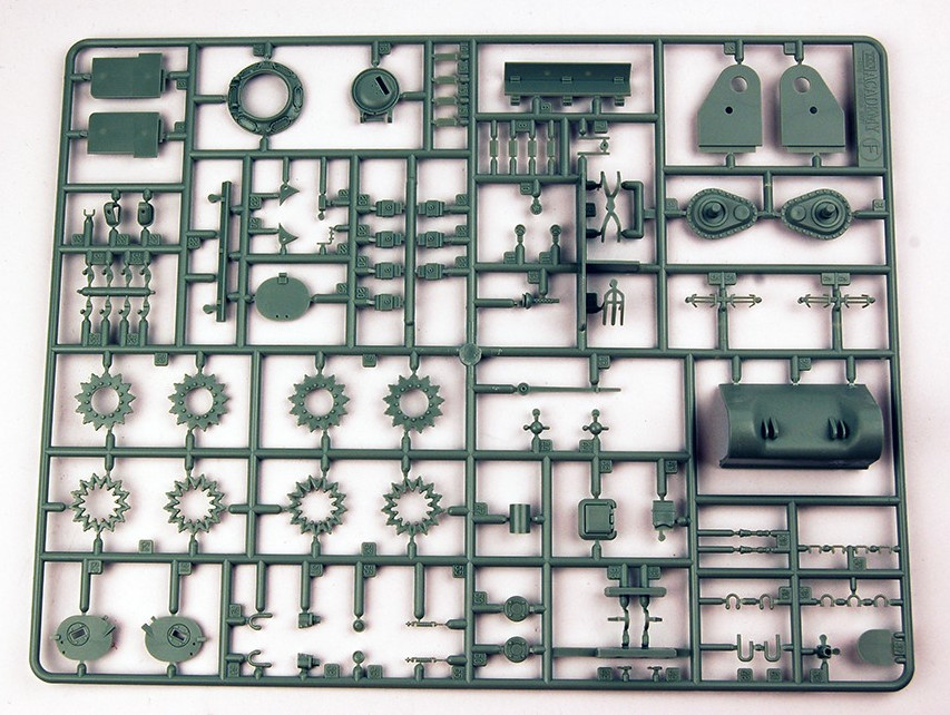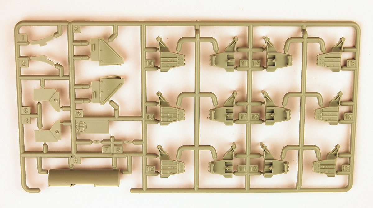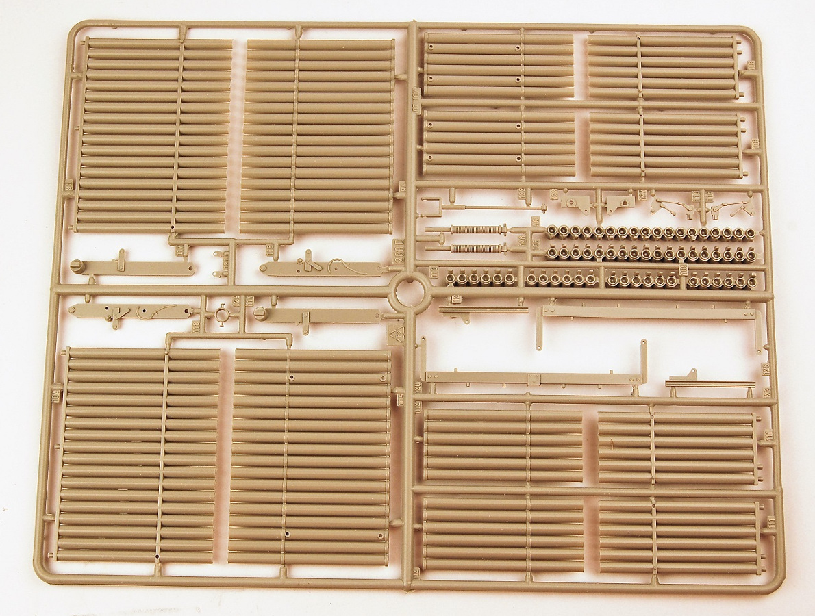 These are the parts from the original Italeri kit. The parts bag even says "Country of Origin: Italy". The Academy and Italeri sprues are identical in layout etc. These will be "challenging" to assemble: the rocket tube units are split into two halves, and they will need very careful alignment when being glued together. Then there will be some challenging work making sure all the tubes are "round" at the front end. There is no diagram in the instructions showing the firing wiring or where this wiring enters the tank. According to what I could discover in my research the wiring all went into the turret through a connection block that replaced the loader's periscope.