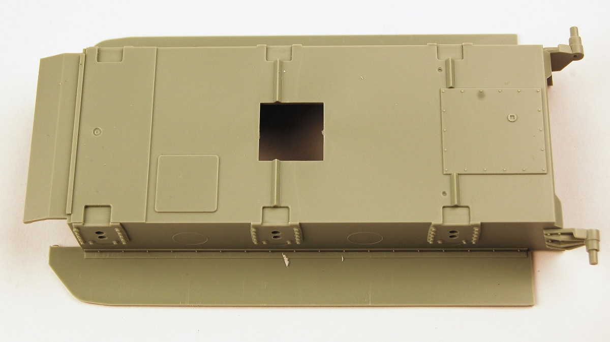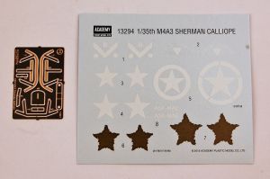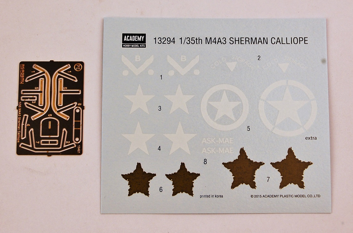 Academy's M4A3 hull is of the large driver/co-driver hatch variety, which is correct for a Sherman Calliope, with a cast one piece transmission housing. The driver's and co-driver's hatches are separate, and can be positioned open or closed. Separate grab handles are included for the hatches. However, there is absolutely no hull interior of any description. There are no crew figures or half figures included in which to position in an opened hull hatch. Academy provides the modeler with alternative parts for the headlight, siren and rear light guards. Either injection molded parts, or photo etched brass parts. While you might opt for the injection molded parts if you are afraid of PE parts, I would strongly caution against this as the injection plastic parts are thick and "clunky". The main hull part, A1, has an irritating issue that has been seen in a number of Sherman hulls over the years: counter sunk weld beads. Sherman welds should be raised on the hulls, not depicted as sunken drainage ditches! Take some water-soluble putty, such as Deluxe Materials "Perfect Plastic Putty" and fill the depressions, and wipe smooth with a damp Q-tip. Once dry, apply primer to seal, and then apply some Archer Transfers weld beads in the appropriate areas.