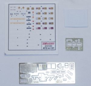 Since Armory is releasing a number of vehicles based on the ZiL-131 chassis, the parts count on this 1/144 ATZ-4-131 is almost the same as the "stock" ZiL-131 kit. This kit also consists of two sprue of injected, plastic pieces; six pieces of resin (the main fuel "tank", and other pieces that are attached to said "tank"); and a photoetch set with 23 pieces of photoetch metal on it, not all used with this kit. In fact the same can be said for the injected, plastic sprue. Since Armory has released a number of different "type" of trucks based on the ZiL-131 chassis, there are parts on the sprue that aren't used for all variants. There are two plastic sprue, one in grey, the other clear. The gray injected sprue consists of 18 pieces, two not being used with this release. The second, injected clear sprue is for everything meant for the cab; there are 17 pieces on the sprue, with seven not being used with this release. Releasing all cab parts in clear makes sense, that way all windows are clear; in fact, Armory also includes a set of masks to use on the cab once it's all together. Excellent. There is also a small set of decals, "license plates", small unit symbols for the door sides and slogans for the main fuel "tank" sides. The decals are meant for five different refuelers, two Ukrainian and three Soviet.