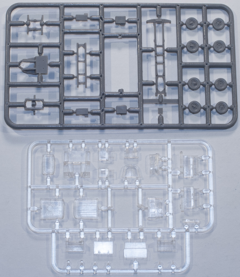 Construction starts with the chassis and other pieces for the underside of the trucks. First is assembled what I assume is a cargo container with a spare tire (and the first piece of photoetch used) then you move on to assembling the drive trains, both front and rear. These are then added to the main chassis, along with the bed frame and two hooks. Then you move to assembling the cab in three different steps before adding the cab to the body. At the same time you add the two fuel tanks.