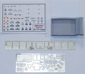 Armory has released a number of 1/144 kits based on the ZiL-131 chassis. Their first release was this "straight" ZiL-131 cargo truck and consists of two sprue of injected, plastic pieces; one piece of resin (the main "bed" for the truck); and a photoetch set with 24 pieces of photoetch metal on it, not all used with this kit. In fact the same can be said for the injected, plastic sprue. Since Armory has released a number of different "type" of trucks based on the ZiL-131 chassis, there are parts on the sprue that aren't used for all variants. There are two plastic sprue, one in grey, the other clear. The gray injected sprue consists of 18 pieces, two not being used with this release. The second, injected clear sprue is for everything meant for the cab; there are 17 pieces on the sprue, with seven not being used with this release. Releasing all cab parts in clear makes sense, that way all windows are clear; in fact, Armory also includes a set of masks to use on the cab once it's all together. Excellent. There is also a small set of decals, mainly "license plates" and small unit symbols for the door sides. These decals are for 10 specific trucks, two Ukrainian, five Soviet, one Czech and two Russian Federation Army.