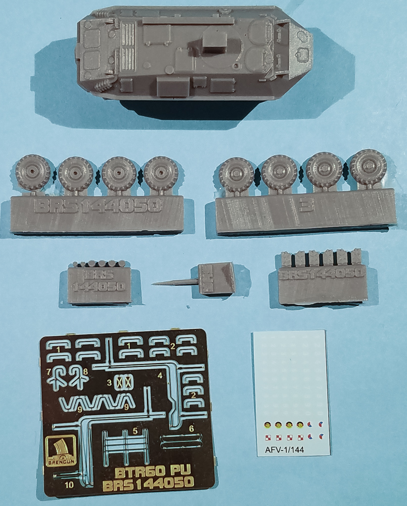 The Brengun 1/144 BTR-60 PU consists of 22 pieces of gray resin and a photoetch fret with 28 pieces of brass on it. A generic decal sheet is also included with Czech, Polish and East German markings, along with a number of various, white "hull numbers".