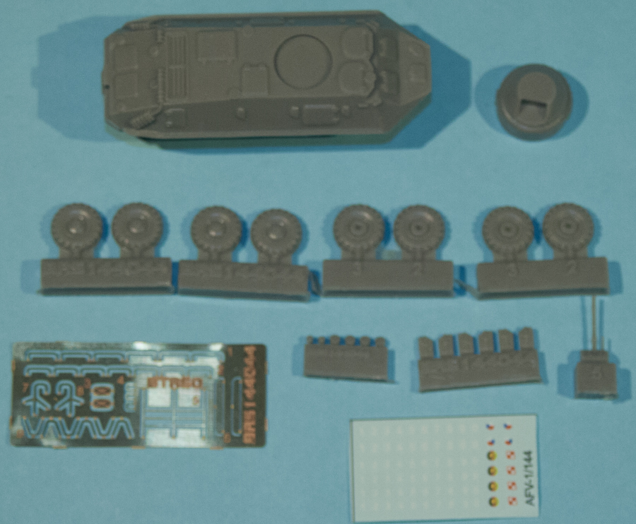 Brengun continues their line of modern, Soviet armored-type vehicles in 1/144 with this release of the BTR-60. The kit consists of 23 pieces of gray resin; one photoetch fret; and a generic decal sheet, which contains emblems for Czechoslovakia, Poland and East Germany, along with separte hull numbers. The photoetch fret has parts for rear view mirrors, a spare parts rack and other items such as grab handles, etc.