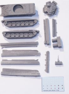 The Brengun 1/144 T-72M consists of 19 pieces of grey resin and a decal sheet they titled "Warsaw Pact Decal 1/144" consisting of various numbers and badges for Czech, Soviet, Polish and NVA tanks.