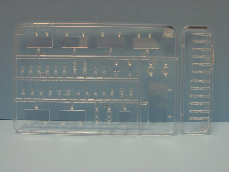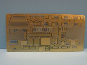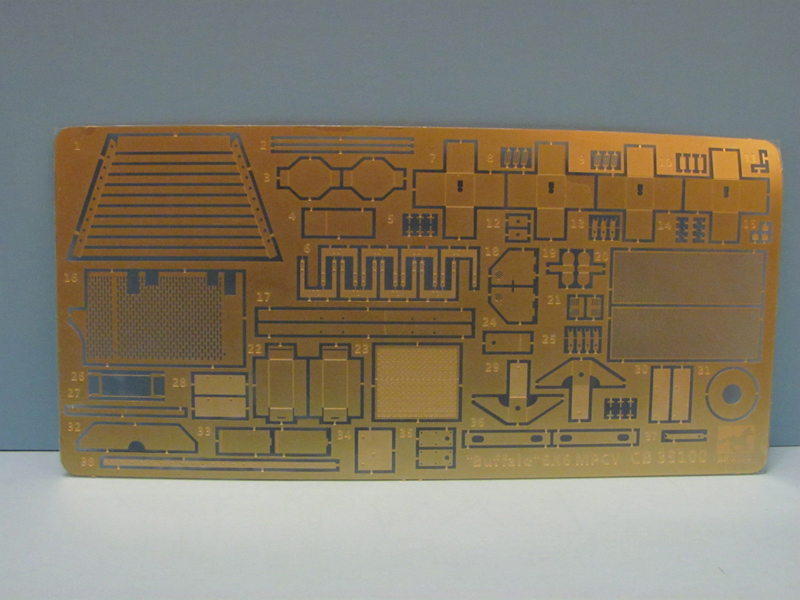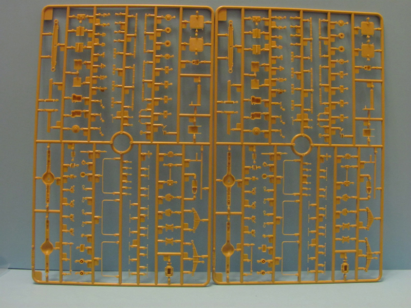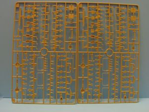 So what do you get for your money? Let’s see: 12 tan colored sprues; 2 clear sprues; 1 PE fret; upper and lower hull; 8 tires; a decal sheet; 3 different size rubber bands (.4mm; .6mm and .8mm diameter) and of course the instructions. The parts count is around 700 plastic parts plus the PE.