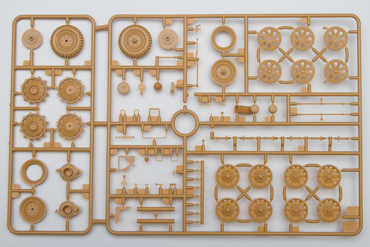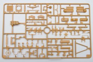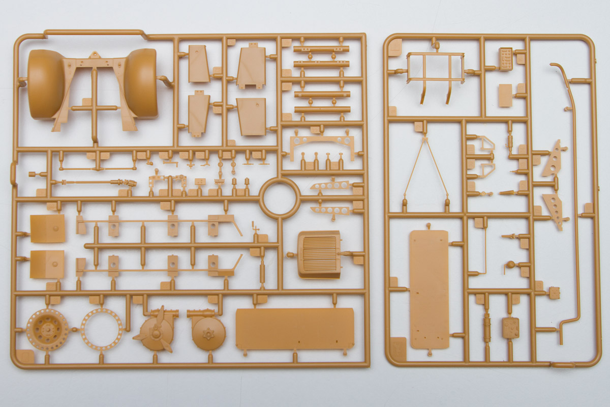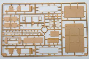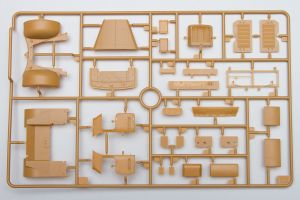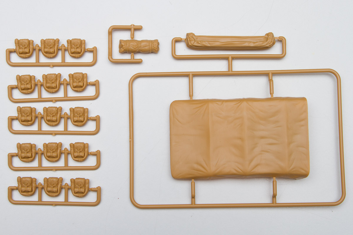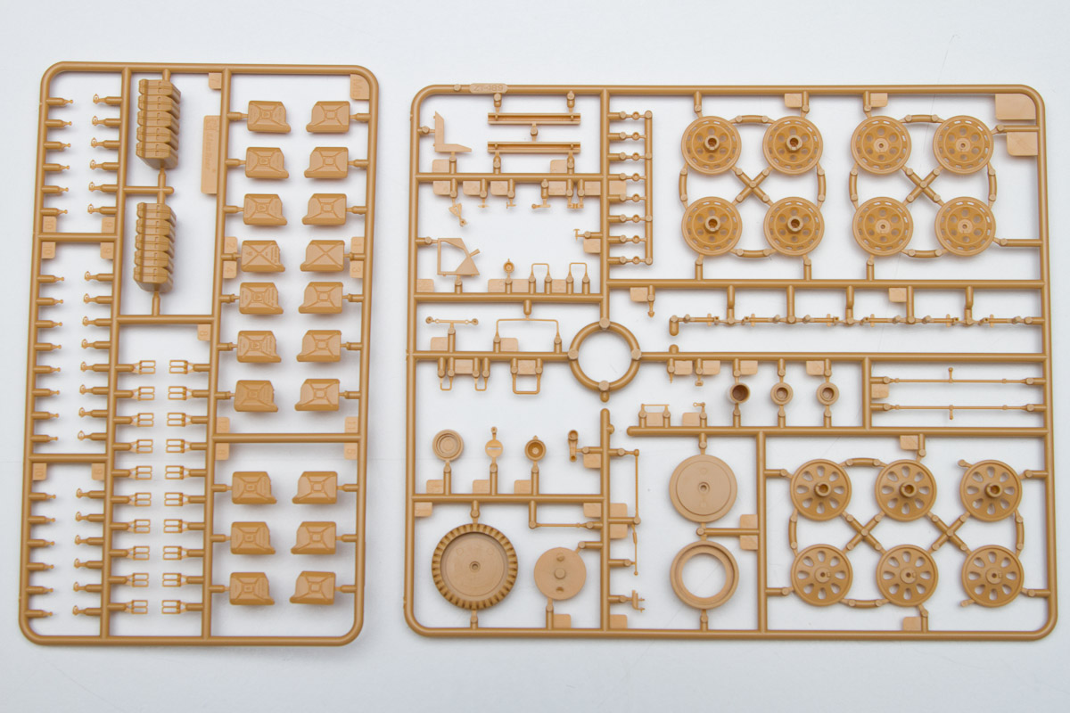 The plastic is Bronco's standard soft, light, tannish-yellow. The two front wheels are made of plastic, with an optional set that comes with separate tires and wheels.. There are 20 jerry cans taking up an entire sprue of fifty parts. Ten rifles, fifteen backpacks and a tent roll are well sculpted and will look great stashed along with the other paraphernalia on the back of the halftrack.