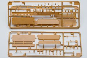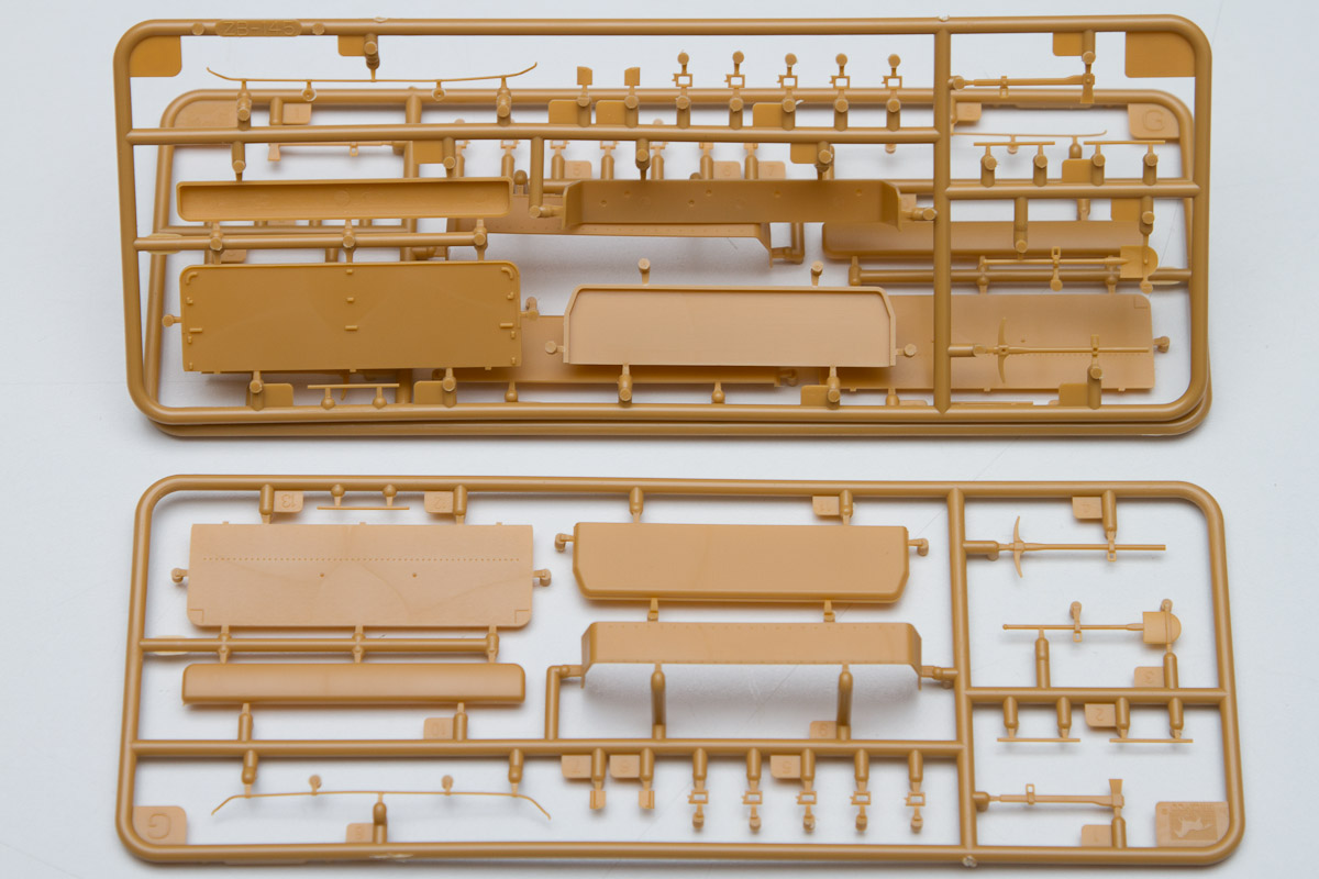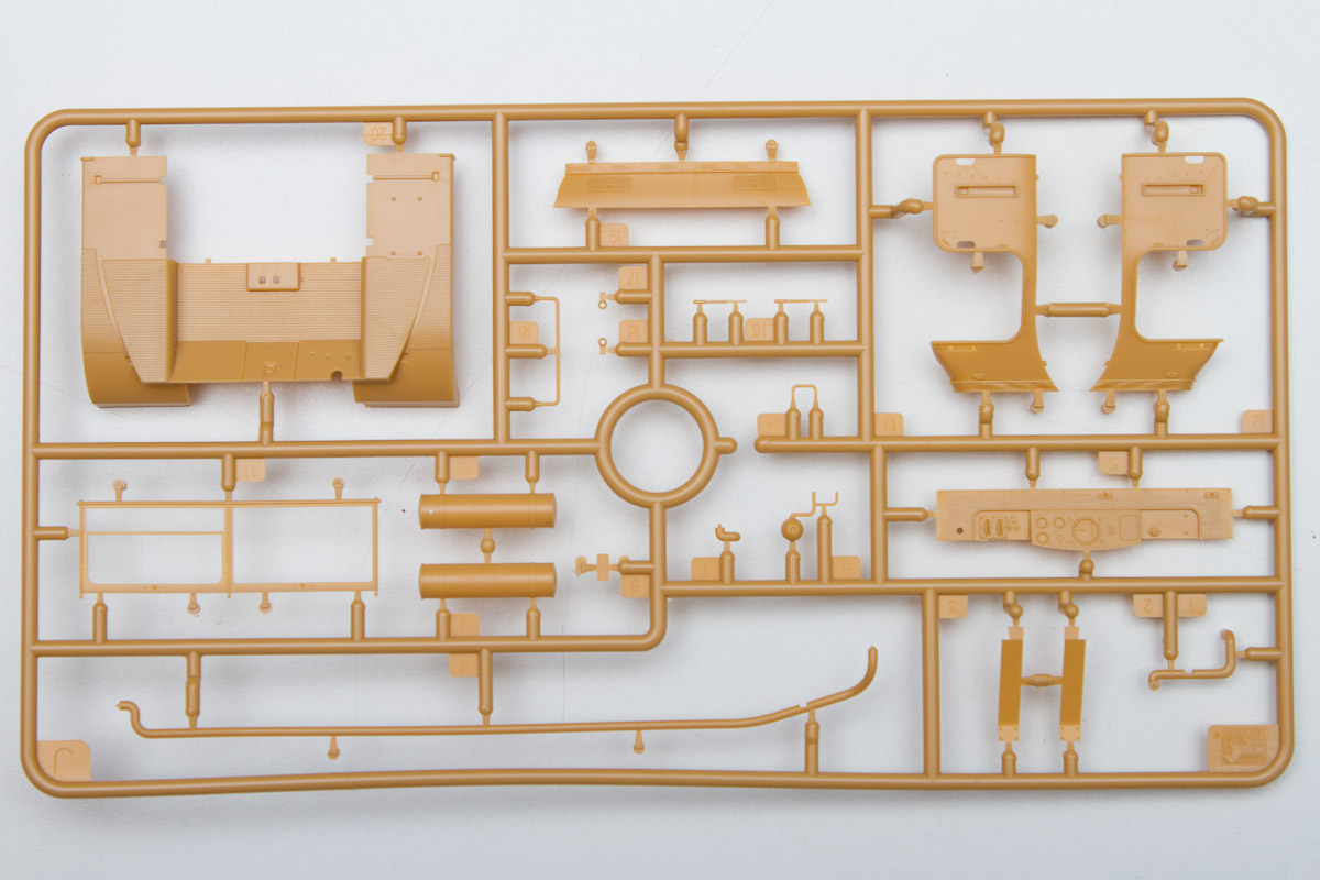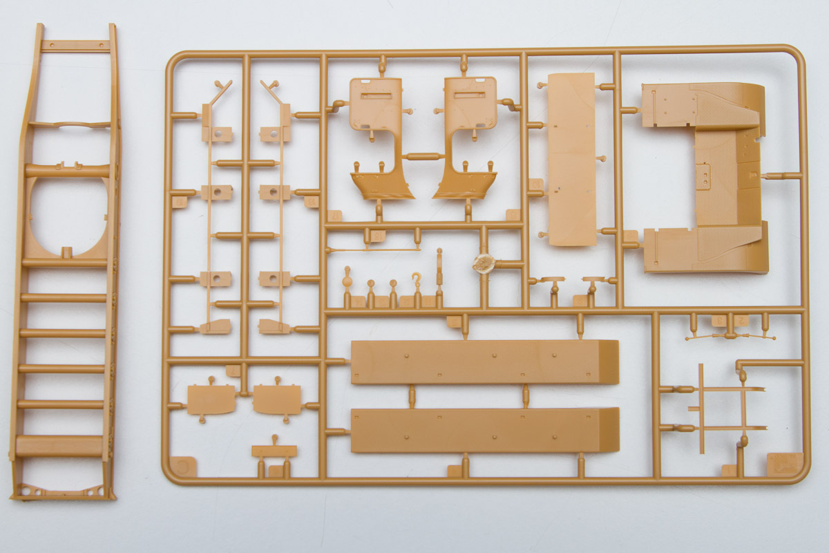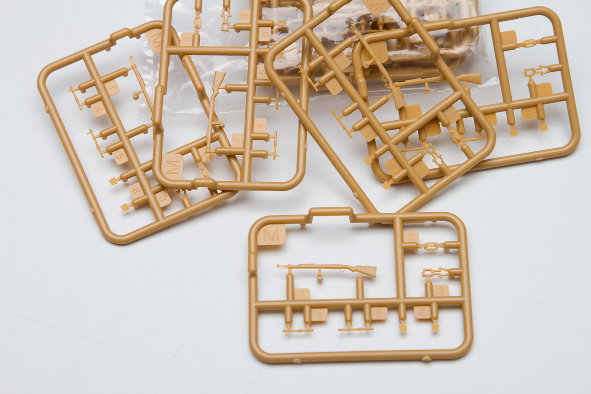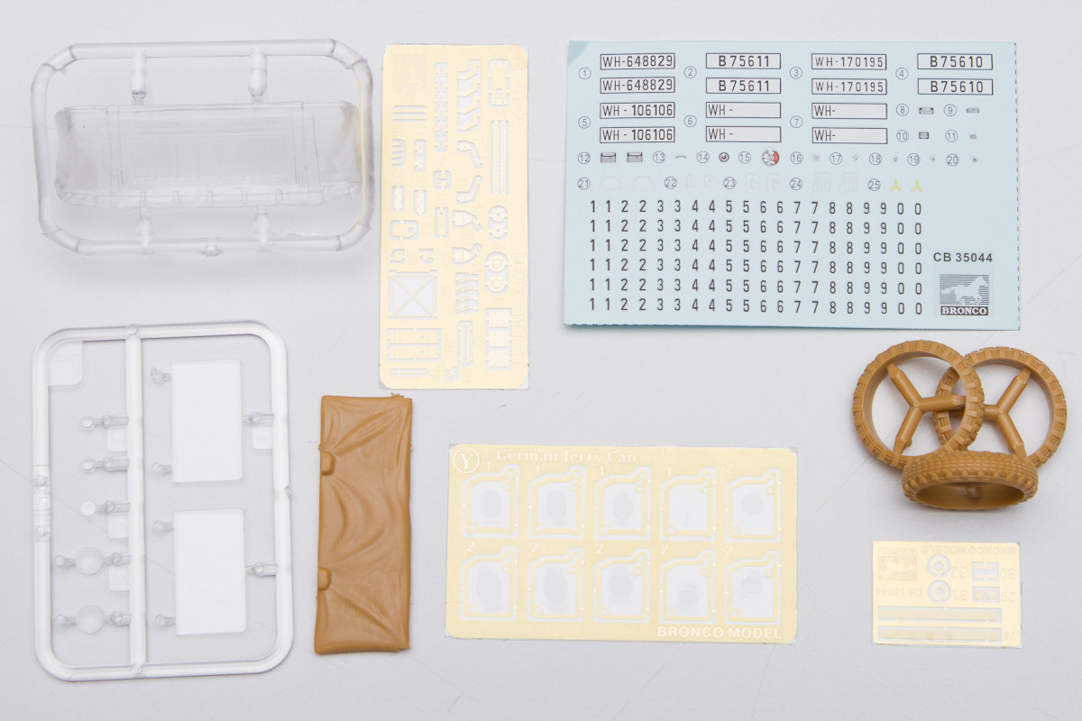 The plastic is Bronco's standard soft, light, tannish-yellow. The two front wheels are made of plastic, with an optional set that comes with separate tires and wheels.. There are 20 jerry cans taking up an entire sprue of fifty parts. Ten rifles, fifteen backpacks and a tent roll are well sculpted and will look great stashed along with the other paraphernalia on the back of the halftrack.