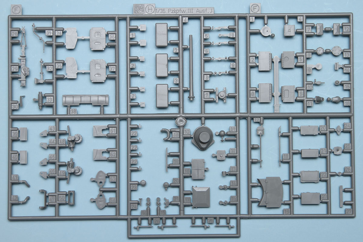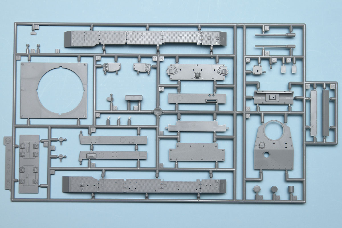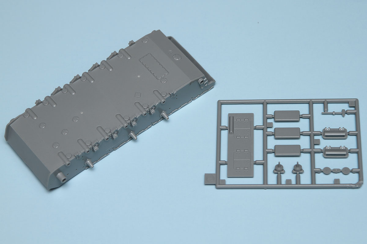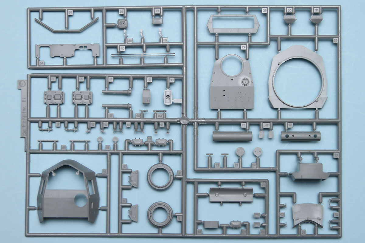 Moving on to the upper hull, this has a main casting with separate side, top and front pieces. There is no interior in this kit, so all the hatches are molded in a closed arrangement. As this is a sub-variant of a stock Panzer III, pay attention to the callouts for the various bits and pieces that need to be removed in the instructions, as there are several. With the upper hull done, it can be mated to the lower hull and the separate fenders added. As one would expect, the fenders catch quite a few useful bits and pieces, such as tools and spare wheels. While the kit includes photoetch, that is just vent grates over intakes. Brackets to hold these various fender bits would have been nice to see on that photoetch fret, but they're easy enough to create for those who are not happy with the plastic representations.