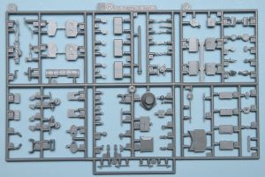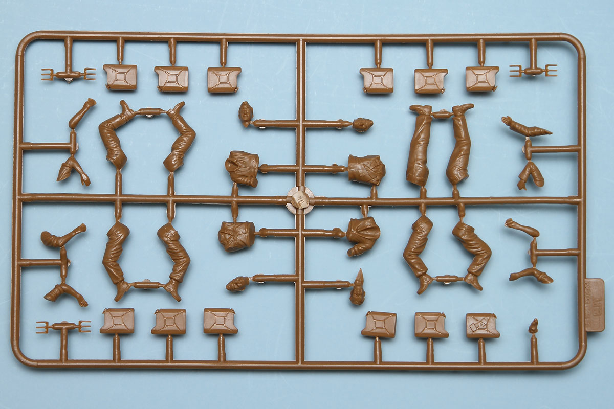 Interestingly, there are no assembly instructions for the figures. However, given their layout on the sprue, assembly should be self-explanatory. There is a total of four figures, one standing and three sitting. The sitting figures are shown in the instruction painting diagram as sitting on fuel can 'stools' made up from the included fuel cans. These are split into right and left halves and feature separate handles. The figures are split as we've come to expect for figure kits, with separate right and left legs, a solid torso, separate head, and separate arms.
