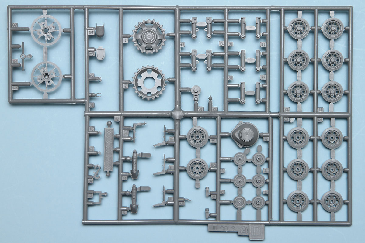 Construction begins with the main hull, and this is pretty much the same as found in other Dragon Panzer III kits. The drive sprocket and return rollers are in two halves, as are the road wheels. The one-piece lower hull in this sample suffers from some warpage, but some judicious application of spacers inside should alleviate that. With the separate suspension pieces put in place and the wheels added, all that's left is to add the tracks. The instructions show the track assembly step with an exclamation point and an hour glass. Assembling 216 individual track links, I think those warnings are a bit obvious, but there you go. Once together, the tracks will look quite nice.