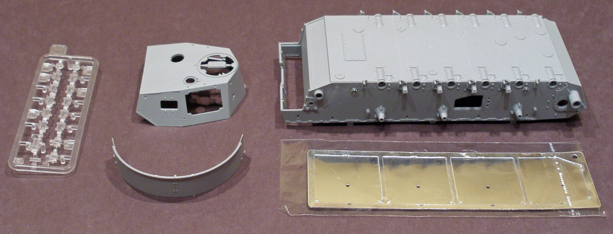 The contents of the box include the lower hull, packaged separately, 15 sprues in soft, light grey plastic, also packaged separately, 2 clear plastic sprues, 1 photo-etch sheet, that includes the star antenna, idler wheel rims and engine exhaust mesh, 2 pre-cut sheets of sturdy metal Schürtzen (skirts), separated into sections, 2 runs of yellow-tan DS track and an 18-page blue and white instruction sheet with 24 steps.![]()